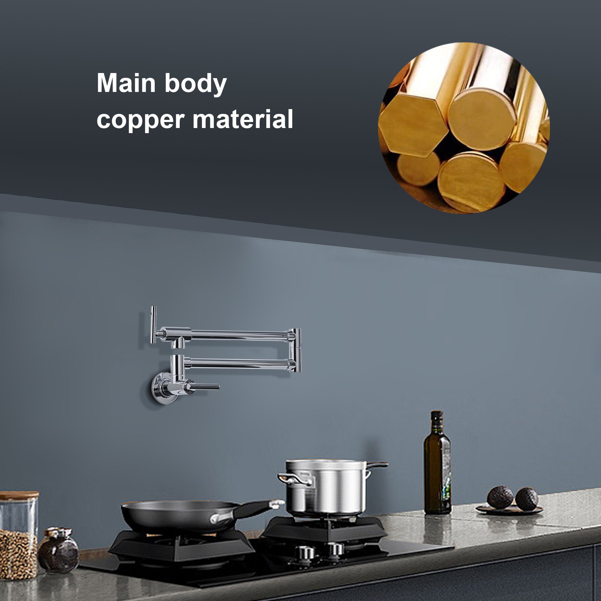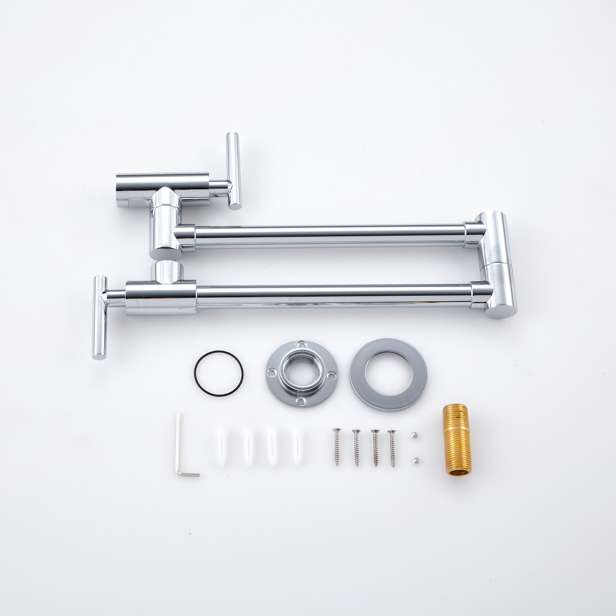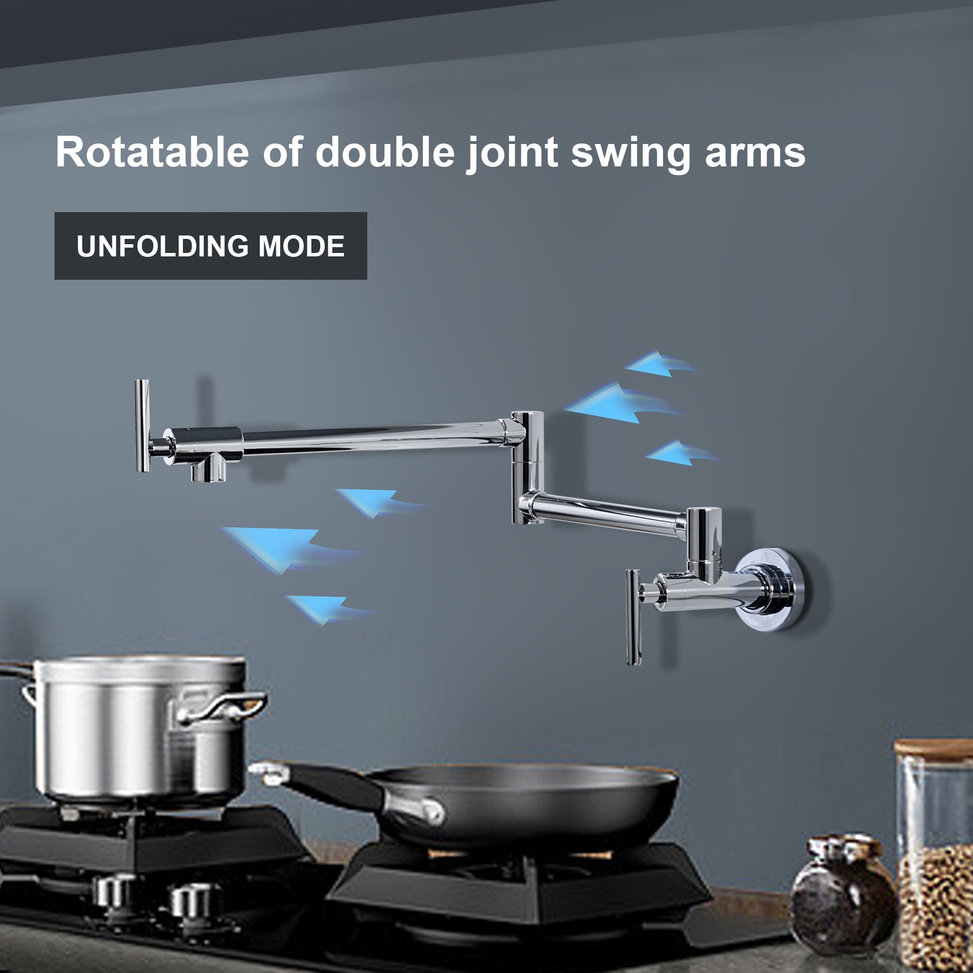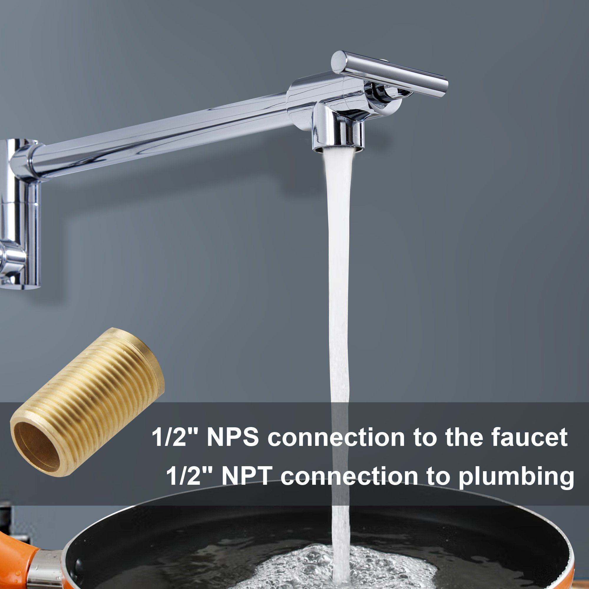 Potfiller Pot Filler Faucet Commercial Wall Mount Kitchen Sink Faucet Folding Stretchable with SiPotfiller Pot Filler Faucet Commercial Wall Mount Kitchen Sink Faucet Folding Stretchable with Single Hole Two Handles Our Pot Filler is With Surface That Remains New Even After Long Periods of Time in a Hot Stove Top Environment,Easy to Clean Spout Reach inch from wall. Handles all toward down design avoid collision with cabinets. Use for only cold water or only hot water. with solid brass ceramic cartridge; No Leak compliant. Aerator provides a steady pressure and straight consistent 3.5 GPM water flow; 100% factory high pressure and low pressure tested Two valves for double flow control; dual swing joints allows the pot filler to easily fold away when not in use NPT 1/2" conical connection thread (without brass fittings), can prevent water leakage without using water tape; NPSM 1/2" connection thread, need to use water tape; Fit for US Standard, with a installation flange for stability .